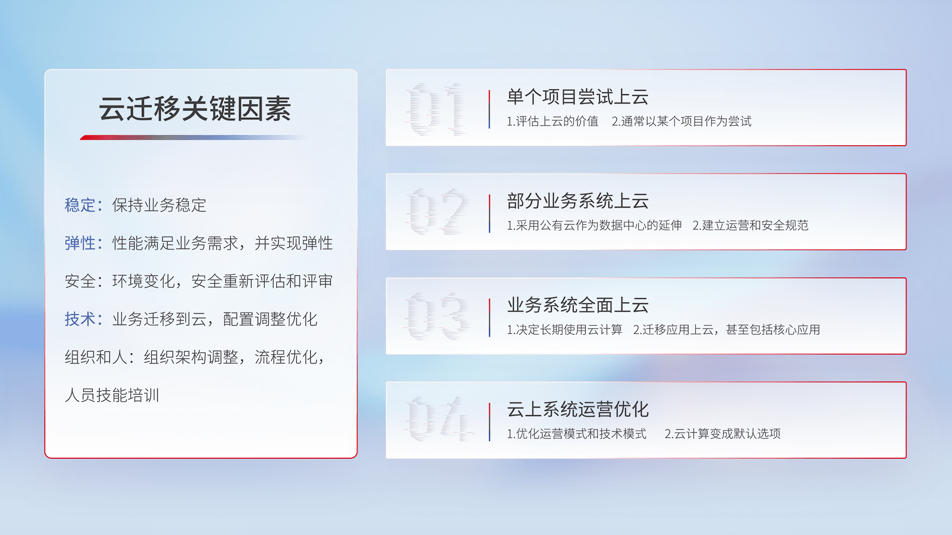 结合实际业务,,,从规划设计、、、、云平台选型、、、云原生改造、、、数据迁移、、集成交付,,,,迁移全过程为客户识别最佳上云路径,,,做好风险识别管理,,,,设计网络架构、、身份权限、、、安全审计合规、、、、操作审计、、、日志审计、、监控告警策略、、、、多站点容灾设计等,,,,对云上基础设施进行整体规划,,,,提升IT治理水平,,以满足弹性、、、高可用、、、高性能的需求。。