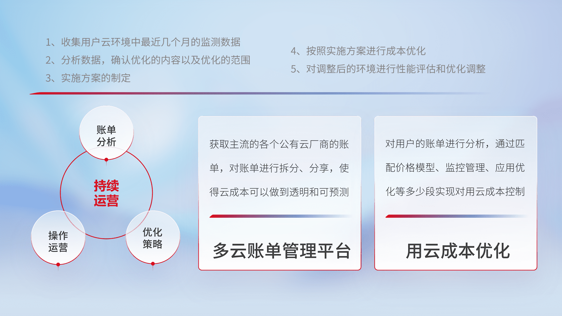 通过多云纳管,,,,以统一的资源数据模型把客户的云资源进行抽象和封装,,,,进而实现对多云资源的统一操作,,,,保障云资源管理的可靠性、、、、稳定性与可用性。。量身定制化运维内容,,,,配置、、、、开发运维、、、、补丁管理、、、、备份、、、监控、、、认证和访问管理、、、、审计和日常巡检等,,,保障在用云过程中的可靠度,,,稳定度以及高可用率。。。。